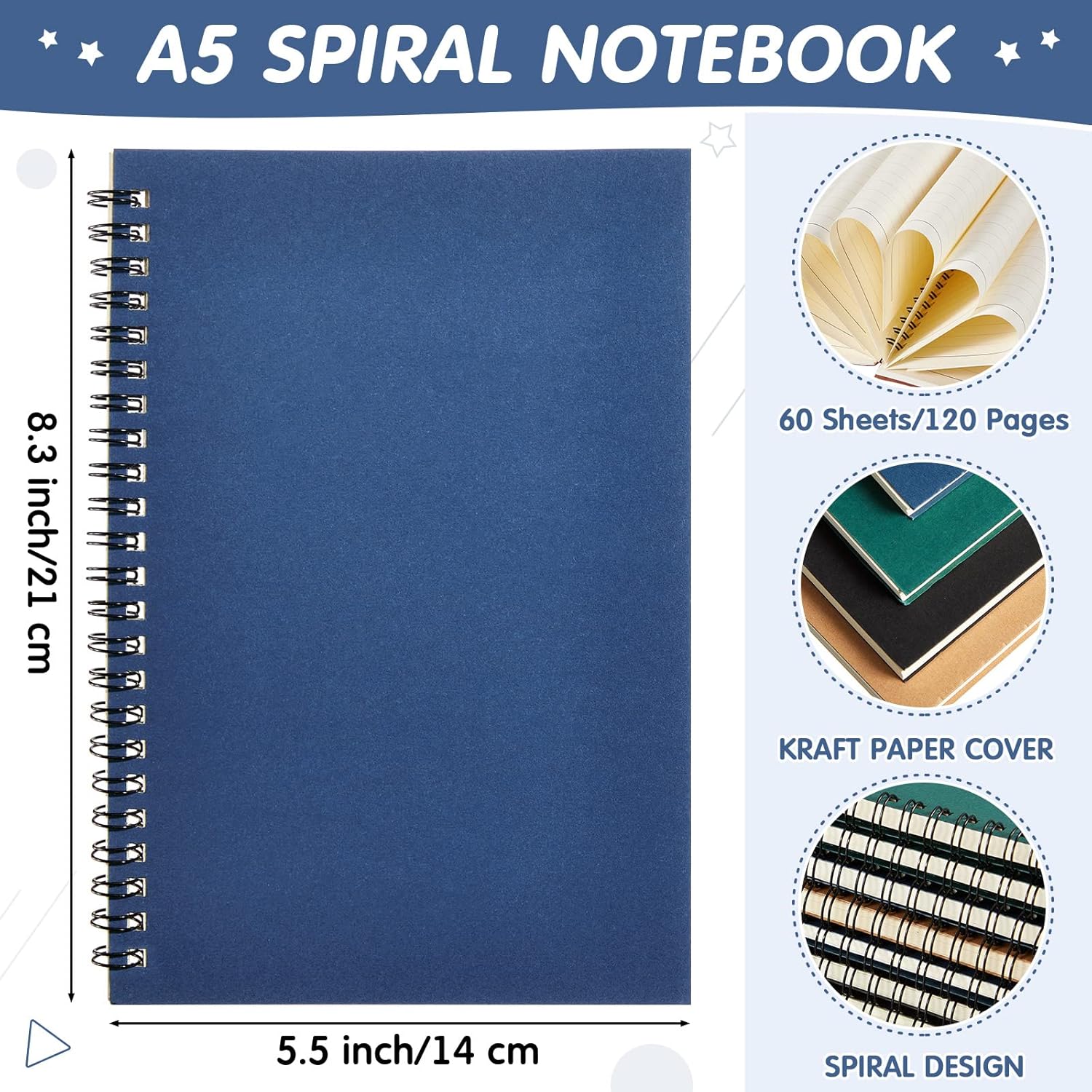 • A5 Size: spiral journals measure approx. 8.3 x 5.5 inches, namely A5 size, each spiral notebook has 120 pages 60 sheets of horizontal line papers, easy to carry, the suitable size is easy to put into for a handbag, school bag or backpack